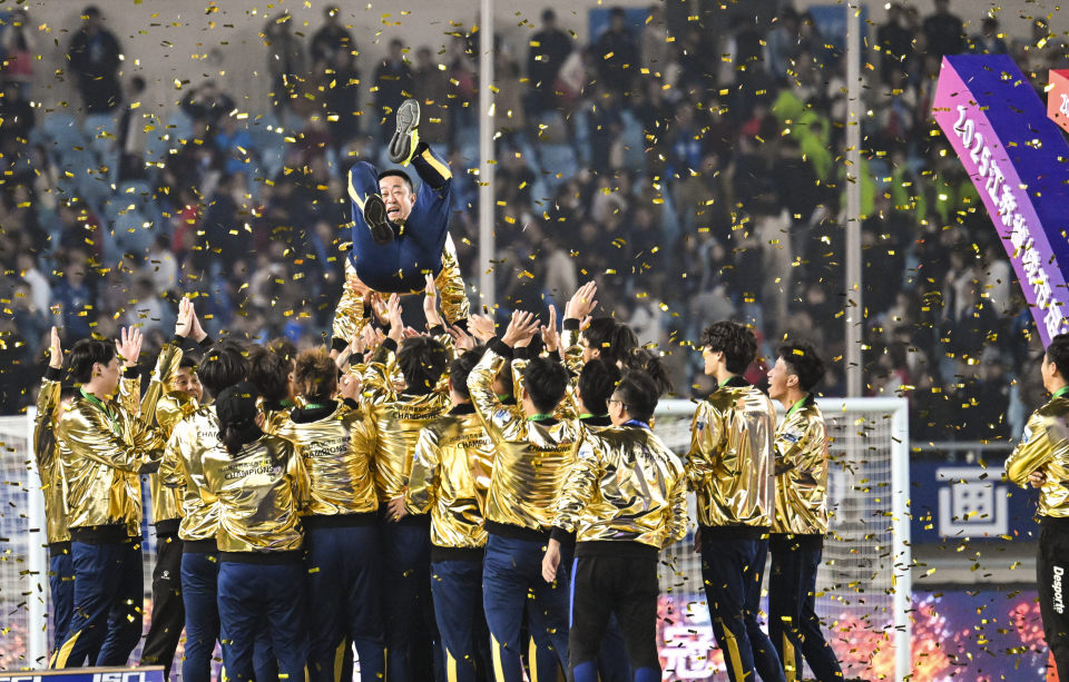 11月1日,冠军泰州队在夺冠后向球迷致意。新华社记者 季春鹏 摄